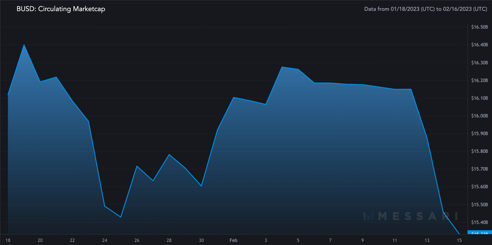 Since Feb. 13, when the news broke, the BUSD market cap has lost roughly $2 billion, down to around $14 billion as of Feb. 16 — the lowest since January 2022.