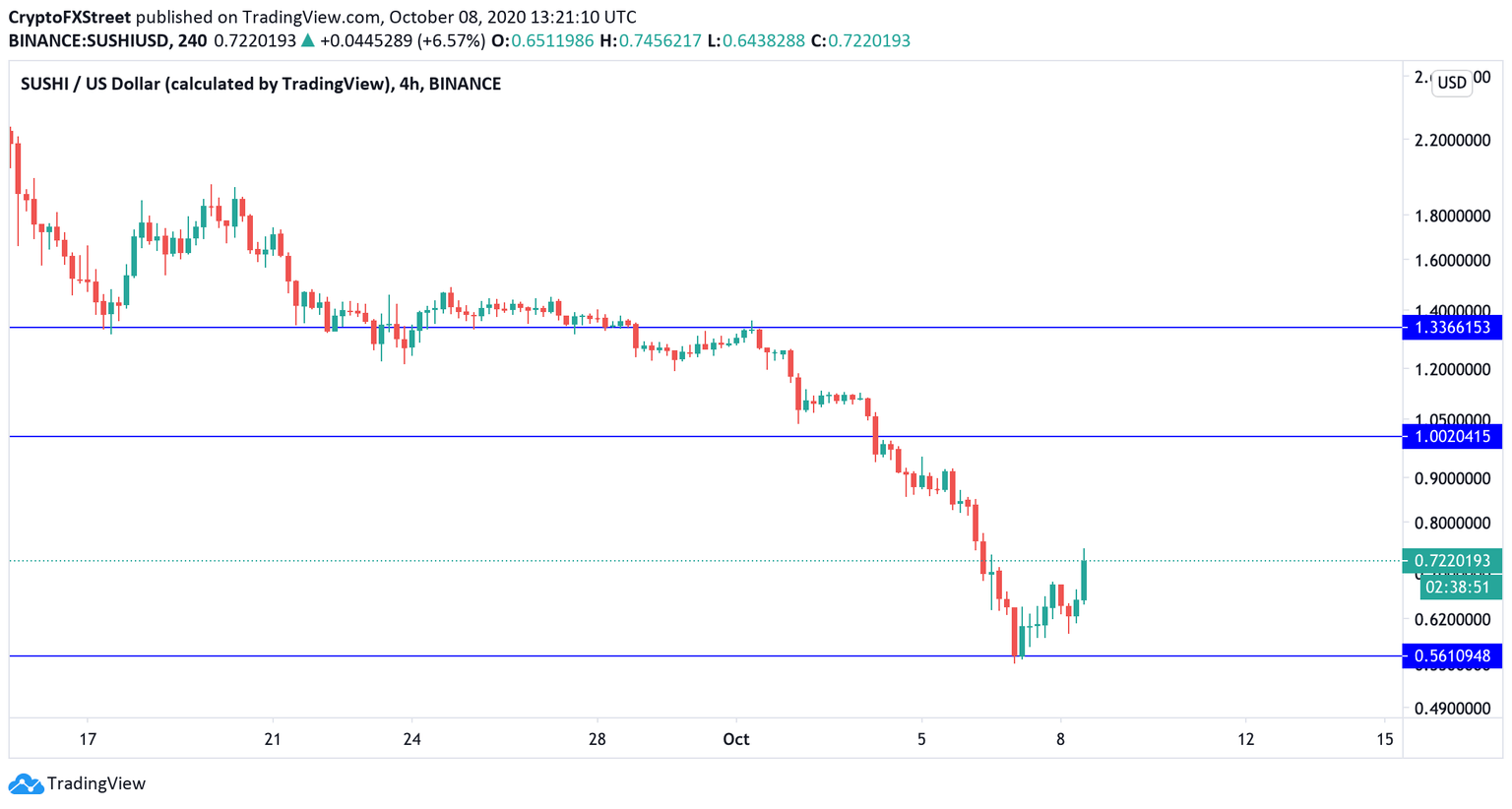 On the intraday charts, SUSHI has already started recovering from the recent lows. The coin bottomed at $0.55 on October 7 and jumped to $0.73 by press time. The first obvious upside target is created by the psychological $1; however, a more robust resistance comes at $1.33. The price has been hovering around this area at the end of September before the bearish momentum gained traction.