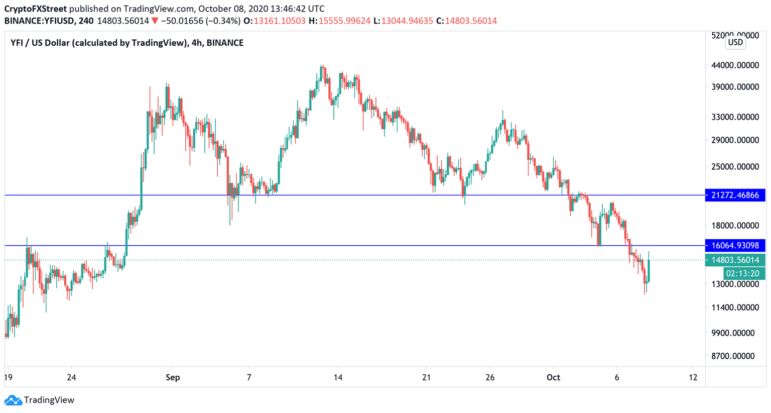 A similar picture is on the YFI charts. The token bottomed at $12,257 during early Asian hours and recovered to $15,300 by press time. The initial resistance is created by $16,000.