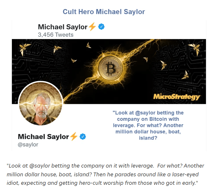 "Look at @saylor betting the company on it with leverage. For what? Another million dollar house, boat, island? Then he parades around like a laser-eyed idiot, expecting and getting hero-cult worship from those who got in early."