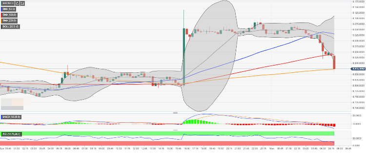 BTC/USD hit the intraday high at $9,063 during early Asian hours and retreated to the area below $8,900 by the time of writing. The first digital coin has lost over 1% of its value on Monday, thought it is still in the green zone on a day-to-day basis. On the intraday charts, SMA50 (Simple Moving Average) on 15-min chart (currently at $9.030) served as a reversal point for BTC/USD. Unable to pass this barrier, the price reversed to the downside and slipped below SMA100 15-min.