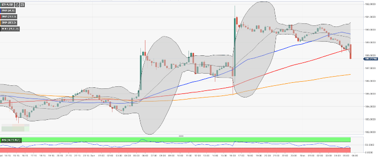 Ethereum, the second-largest digital asset with the current market capitalization of $20.5 billion, is changing hands at $187.60 amid increased downside pressure. ETH/USD has gained about 1.5% since this time on Sunday and lost over 1% since the beginning of the day. Looking technically, ETH/USD may extend the downside towards $186.50 (SMA200 15-min chart).