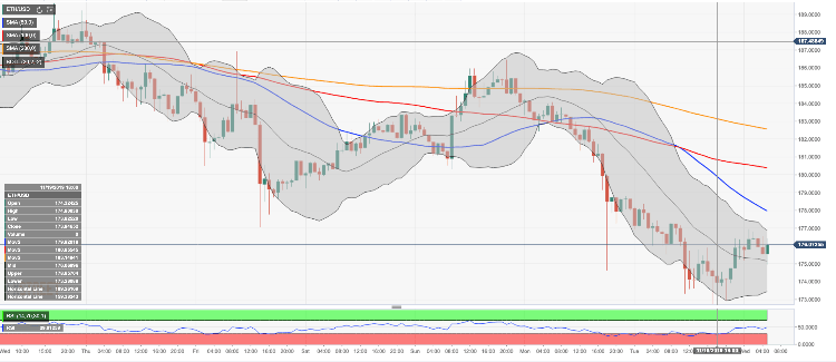 Ethereum, the second-largest digital asset with the current market capitalization of $19.2 billion, has settled above $175.00 after a short-lived sell-off to $172.75 on Tuesday. ETH/USD has over 1% on a day-to-day basis and stayed unchanged since the beginning of Wednesday. At the time of writing, ETH/USD is changing hands at $175.75, while the initial support is created by the middle line of 1-hour Bollinger Band.