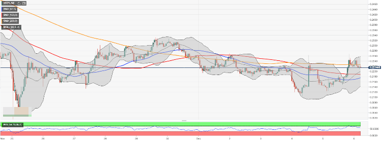 Ripple's XRP topped at $0.2268 late on Thursday but failed to hold the ground. At the time of writing, XRP/USD is changing hands at $0.2210, unchanged since the beginning of Friday, with over 3.5% gains on a day-to-day basis. The initial support is created by a psychological $0.2200. However, we will need to see a sustainable move below $0.2170 (SMA200 1-hour) for the sell-off to gain traction. The resistance is created by a $0.2260-0.2270 area that includes the recent high and the upper line of 1-hour Bollinger Band.