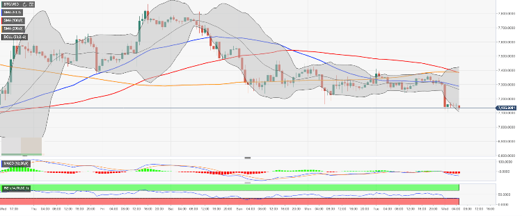 BTC/USD has retreated from Tuesday's high of $7,400 to trade at $7,135 by the time of writing. The coin has lost about 2% of its value both since the beginning of the day and on a day-to-day basis. The local support is located at the lower line of 1-hour Bollinger Band a5 $7,105. Once it is broken, the sell-off is likely to continue with the next focus on psychological $7,000.