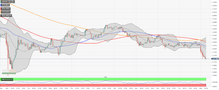 Ripple's XRP has crashed below $0.2200 and touched $0.2100 during early Asian hours. The coin is down 3% in recent 24 hours. A sustainable move below $0.2100 may trigger a sell-off towards November 25 low at $0.2014. The local resistance is created by $0.2180 ( the middle line of 1-hour Bollinger Band), followed by $0.2200.