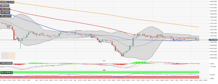 BTC/USD has settled above $7,000 to trade at $7,070 at the time of writing. The first digital asset has stayed in a tight range since Tuesday as the recovery stalled on approach to $7,350 resistance. Currently, the nearest support comes at psychological $7,000, reinforced by the upper line of 1-hour Bollinger Band. A sustainable move above this barrier will trigger further sell-off towards $6,800.