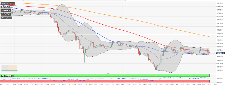 Ethereum is hovering above $145.00, off the intraday high registered at $148.90. The second-largest digital asset with the current market capitalization of $16 billion, has lost over 1.3% since the beginning of the day and stayed unchanged in recent 24 hours. ETH/USD is supported by $144.00 with the lower line of 1-hour Bollinger Band located below this handle. An initial resistance is created by the daily high and upper line of 1-hour Bollinger Band on approach to $149.00