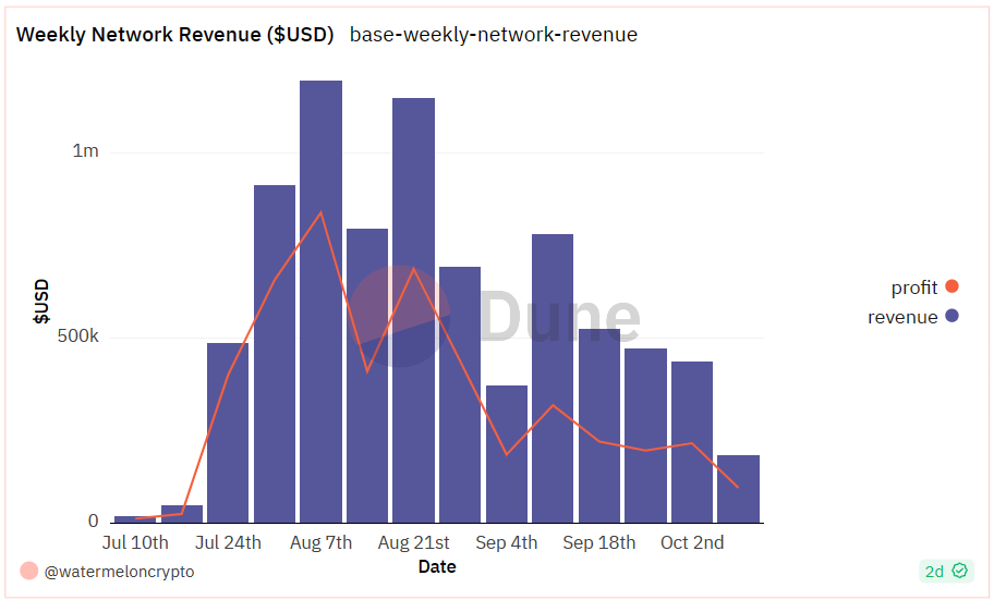 Coinbase has suffered an 84% decline in revenue for its BASE layer-2 solution seven weeks after earnings peaked. Soon after its launch on August 9, 2023, BASE – which was seen as a competitor of the likes of Optimism and Arbitrum – raked in over a million US Dollars in revenue, but since then, earnings have slumped more than fivefold. Now, the chain is facing more backlash than praise.