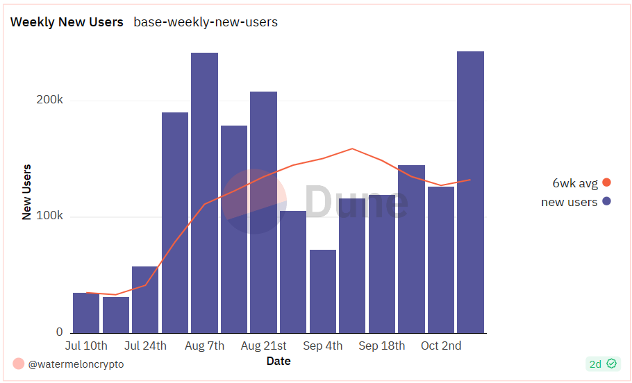 Meanwhile, user data paints a markedly different picture, with the number of new users in the last week reaching 242,650, which is nearly double the amount of new users observed in the week before. Taken together with the fall in revenue it indicates that although a higher number of users are on BASE, they are shifting less tokens.