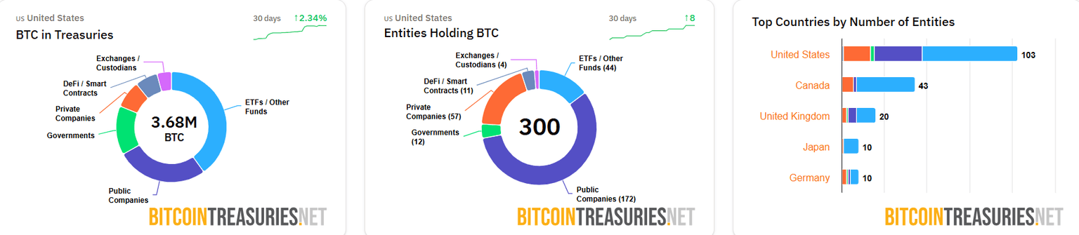 On the institutional side, the US is the top among the countries by number of entities, with over 3.68 million in BTC treasuries and 300 companies (public and private), surpassing countries like Canada and the United Kingdom, as shown in the chart below.