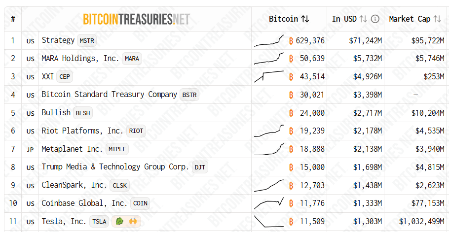 Among the US-based corporate companies, Michael Saylor’s Strategy, formerly MicroStrategy, currently holds 629,376 BTC, followed by MARA Holding with 50,639 BTC, according to BitcionTreasuried.Net data.