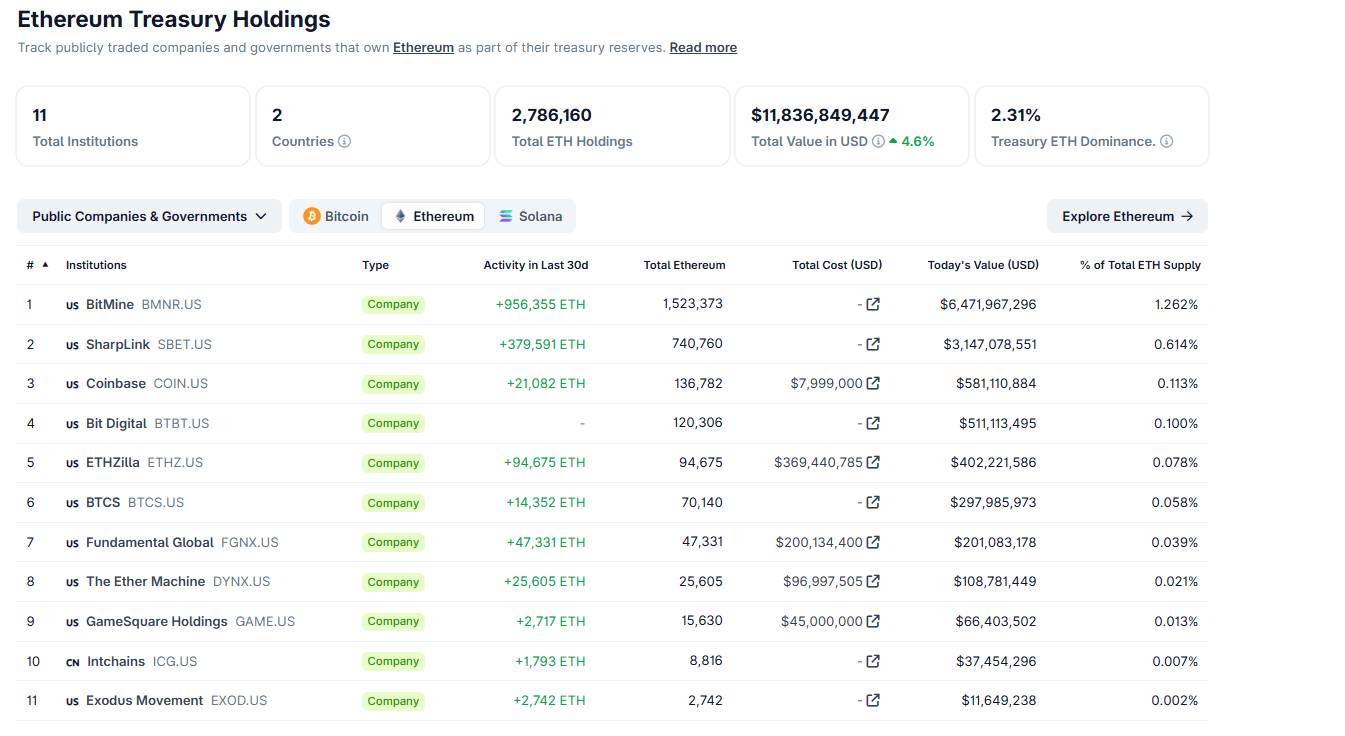 Apart from US companies and the government increasing their BTC holdings. CoinGecko data below shows that the list of public companies holding Ethereum is also rising. The eleven companies tracked by CoinGecko hold 2.3% of the Ether supply, and over 2.78 million. 10 out of 11 companies are from the US and have accumulated more Ethereum tokens, even as retail investors continue to take profits, in the last thirty days.