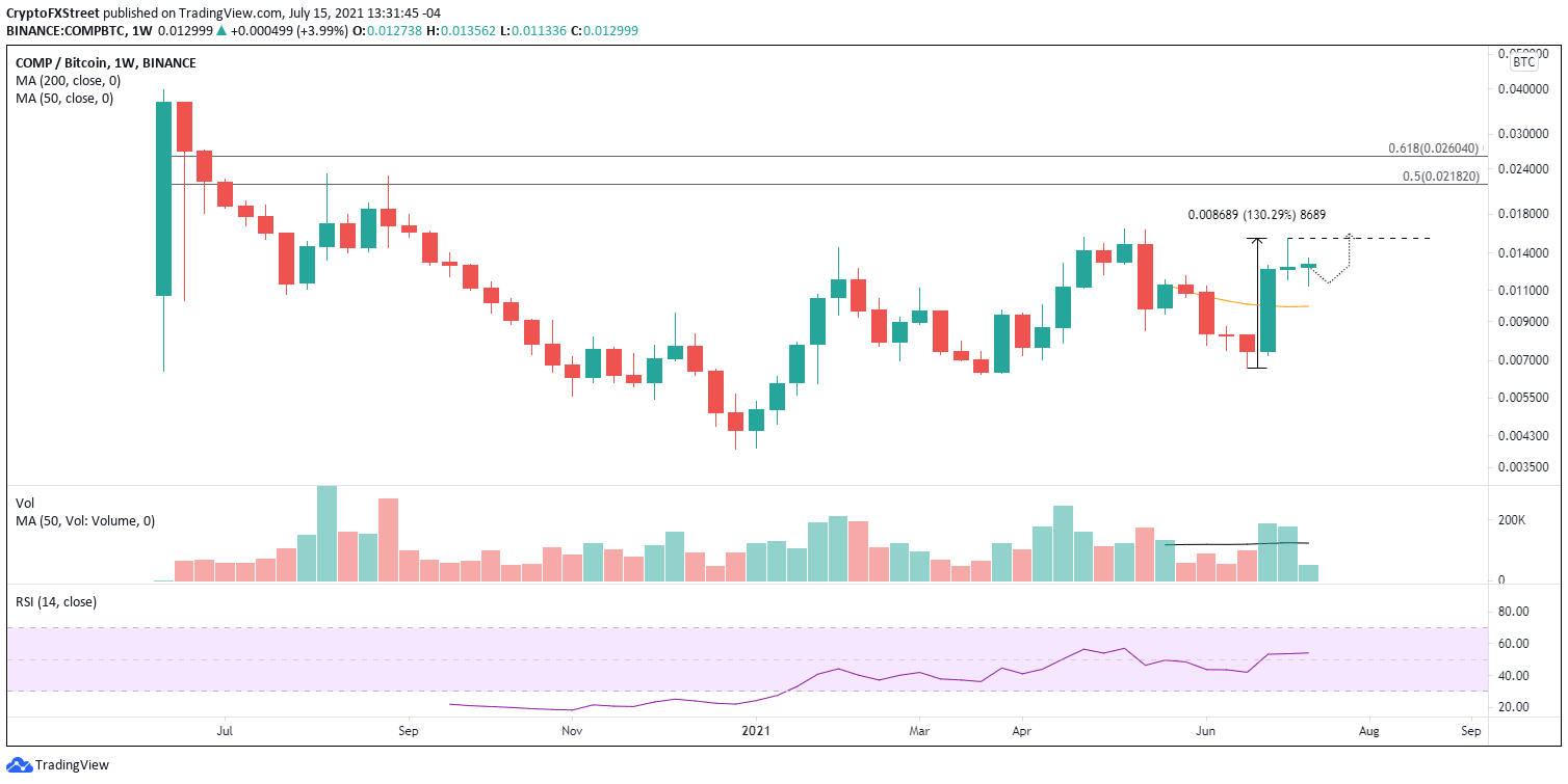 The compelling opportunity for Compound price is reinforced by the high tight flag pattern on the COMP/BTC chart. The pair rallied 130% from the June 22 low to the July 6 high of $0.015 before correcting 26%. The corrective process should not exceed three weeks.