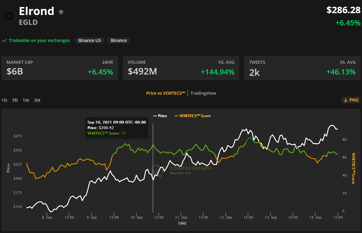 Data from Cointelegraph Markets Pro and TradingView shows that since hitting a low of $52 on June 22, the price of EGLD has charged 437% higher to a new all-time high at $302.14 on Sept. 14.