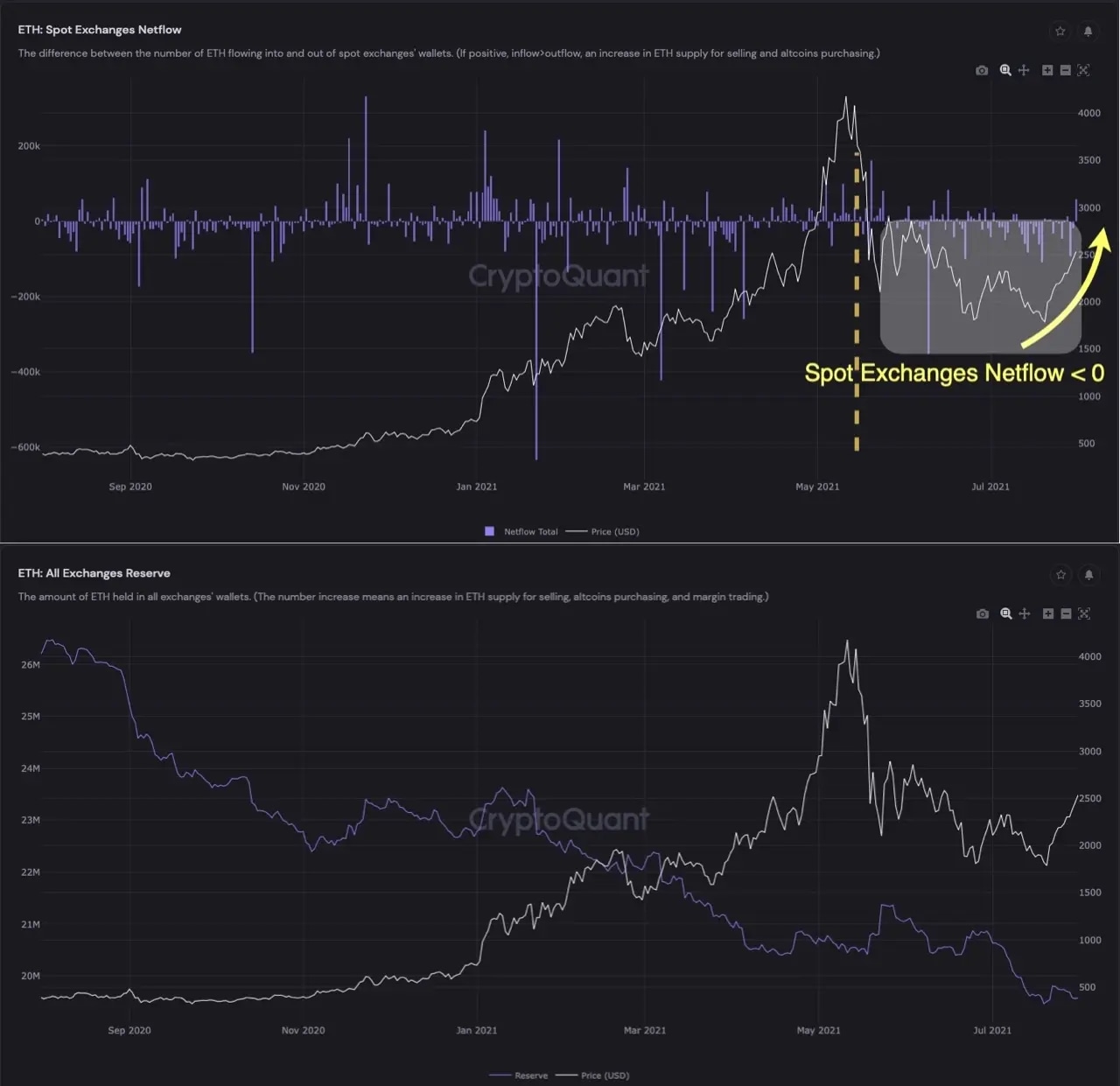 Spotted on CryptoQuant, the three metrics involved tracking Ether reserves across all exchanges and their outflow from trading platforms, as well as the volume of ETH tokens being deposited to Ethereum 2.0 smart contract.