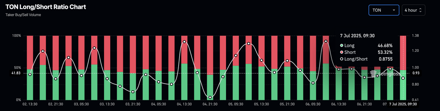 CoinGlass’ data indicates a bearish tilt as the taker sell volume accounts for 53.32% of all executed orders in the last four hours, resulting in a long/short ratio of 0.8755.