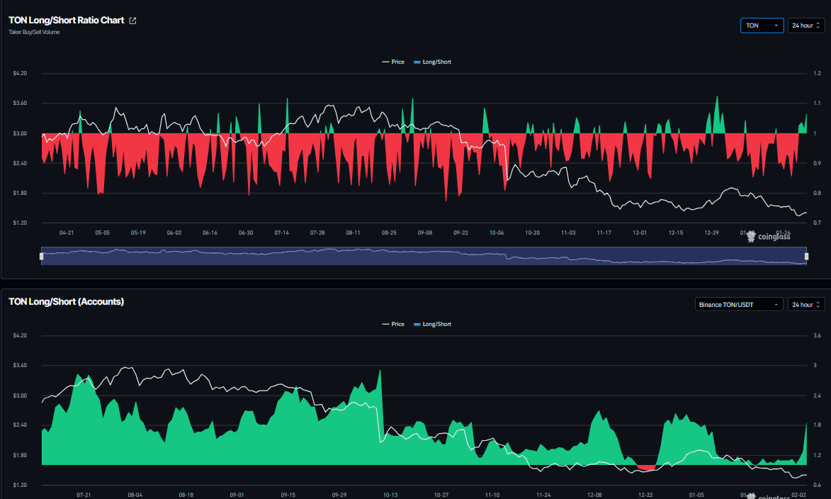 CoinGlass data shows that Toncoin's long-to-short ratio reads 1.06 on Wednesday and has been steadily rising. The ratio above one reflects bullish sentiment in the markets, as more traders are betting on the asset price to rally. In addition, the long bets on the Binance exchange reached 1.84 on Wednesday, the highest level since January 7, further supporting the recovery thesis.