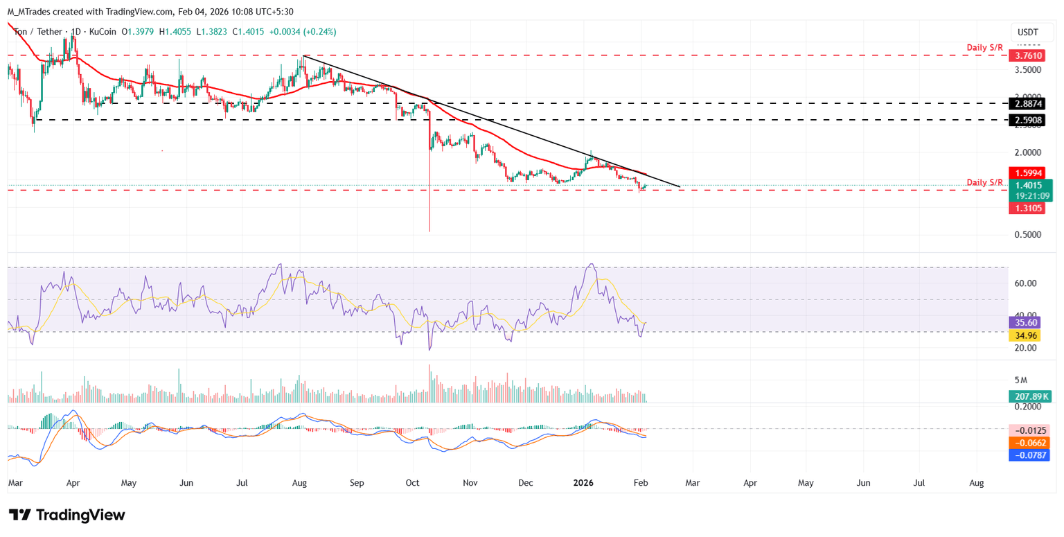 Toncoin (TON) is extending its rebound, trading above $1.40 at the time of writing on Wednesday, after recovering 4.5% over the past two days, following last week’s massive correction. The derivatives data shows improving sentiment with rising long bets and funding rates turning positive. On the technical side, the outlook indicates early signs of recovery for TON, with indicators showing fading bearish momentum.