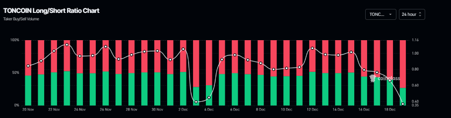 Moreover, the long-to-short ratio of TON reads 0.36 on Friday, the highest level in a month. A ratio below one indicates rising bearish sentiment, as traders are betting on the asset price to fall.