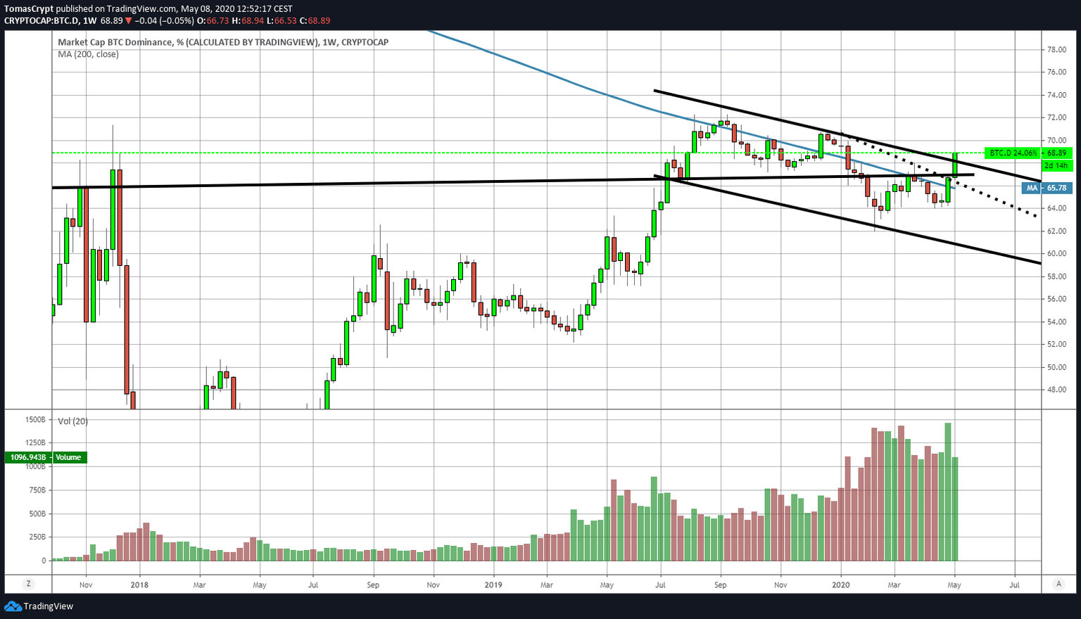 The Bitcoin dominance weekly chart shows the upward breach of the long-term downward trend line and opens up a new, strongly bullish scenario for Bitcoin's aspirations.