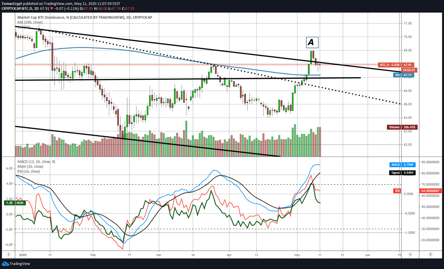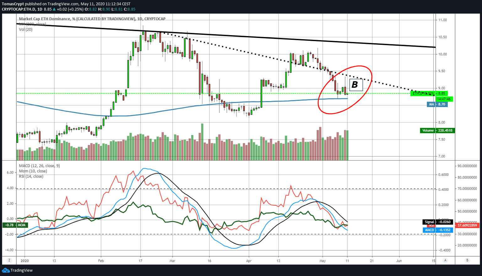 In the Ether dominance chart (B), we see the confirmation of this event. At first, sales concentrated on Bitcoin, and this had a definite impact on the dominance level of Ether. In a few minutes, the market swung towards the Ether. Later, the fear spread and reached all the assets of the crypto ecosystem.