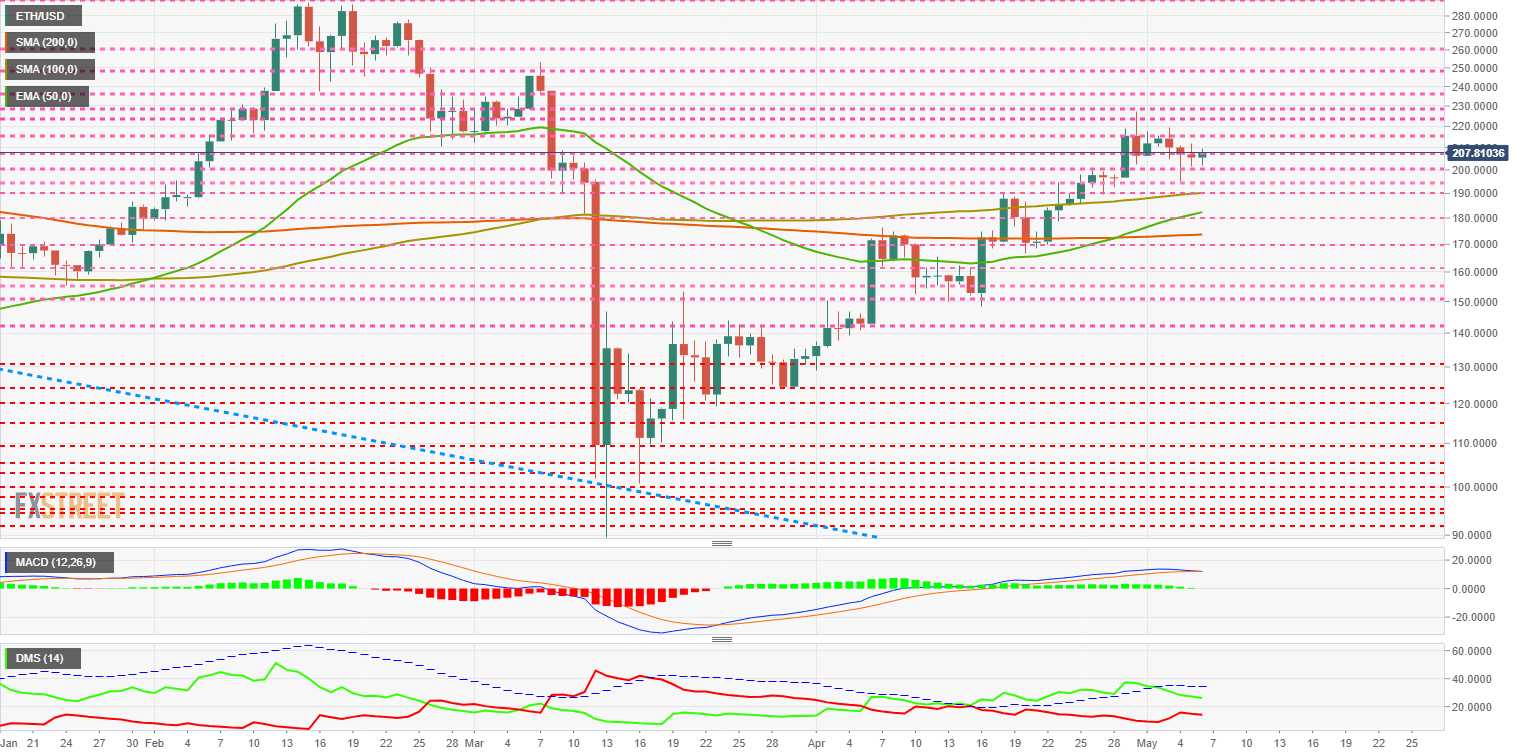 The ETH/USD pair is currently trading at $207 and find support at the price congestion level at $205.