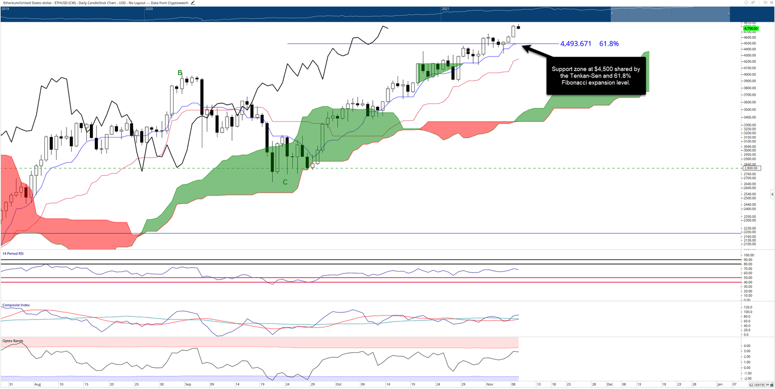 Given that Bitcoin has recently made new all-time highs, any slight pullback may be bought up immediately. A retracement to the Tenkan-Sen and Kijun-Sen may not occur. Any pullback projections will be invalidated if Bitcoin closes above $68,000 or moves beyond $70,000.