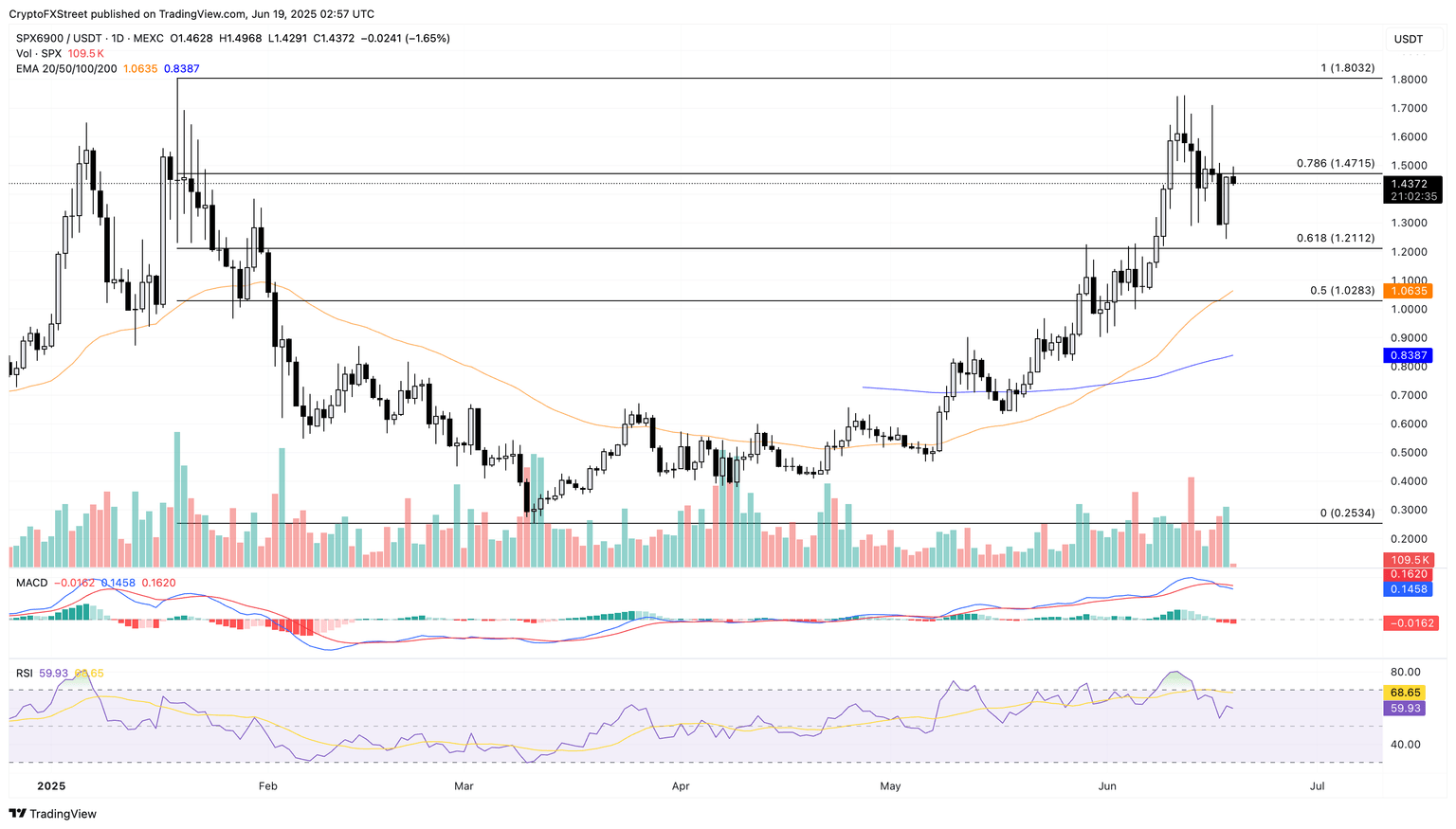 The meme coin faces opposition at the $1.47 support level, aligned with the 78.6% Fibonacci retracement drawn from the all-time high of $8.03 to the year-to-date low of $0.25. Closing above this could drive SPX toward its all-time high.