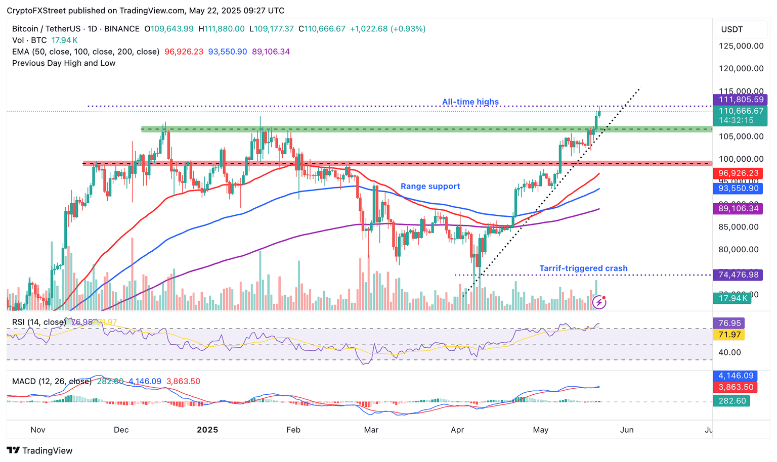 In the meantime, BTC’s price hovers at around $110,666 at the time of writing, up nearly 1% on the day. The Moving Average Convergence Divergence (MACD) indicator’s position is significantly above the center line, which supports the bullish outlook.