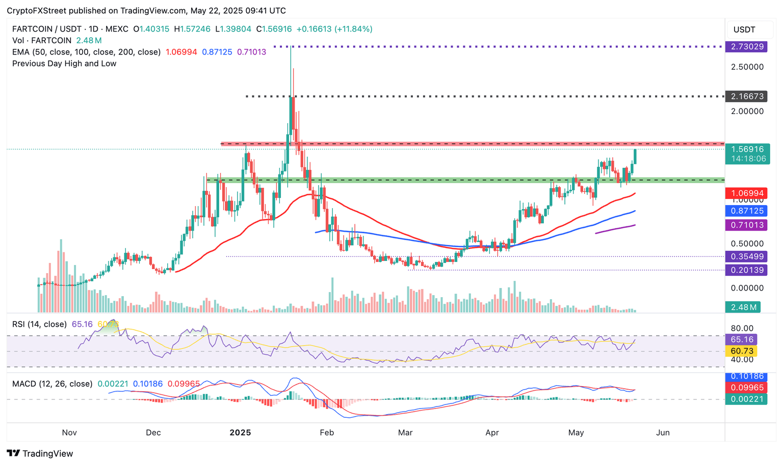 Meme coins, including Fartcoin, explored higher highs alongside Bitcoin as sentiment improved in the crypto market. Fartcoin’s price trades at $1.56, up over 10% on the day. The token is testing short-term resistance at around $1.60, which is highlighted in red on the daily chart below.