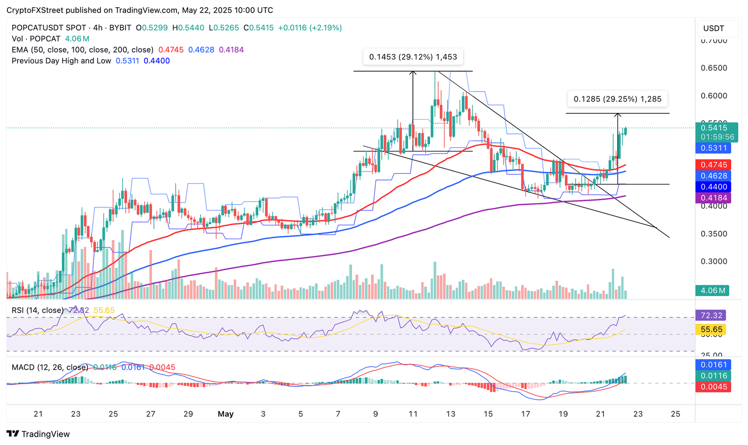 - Popcat’s rally follows a descending triangle pattern’s breakout with a 29% target, supported by increasing volume.