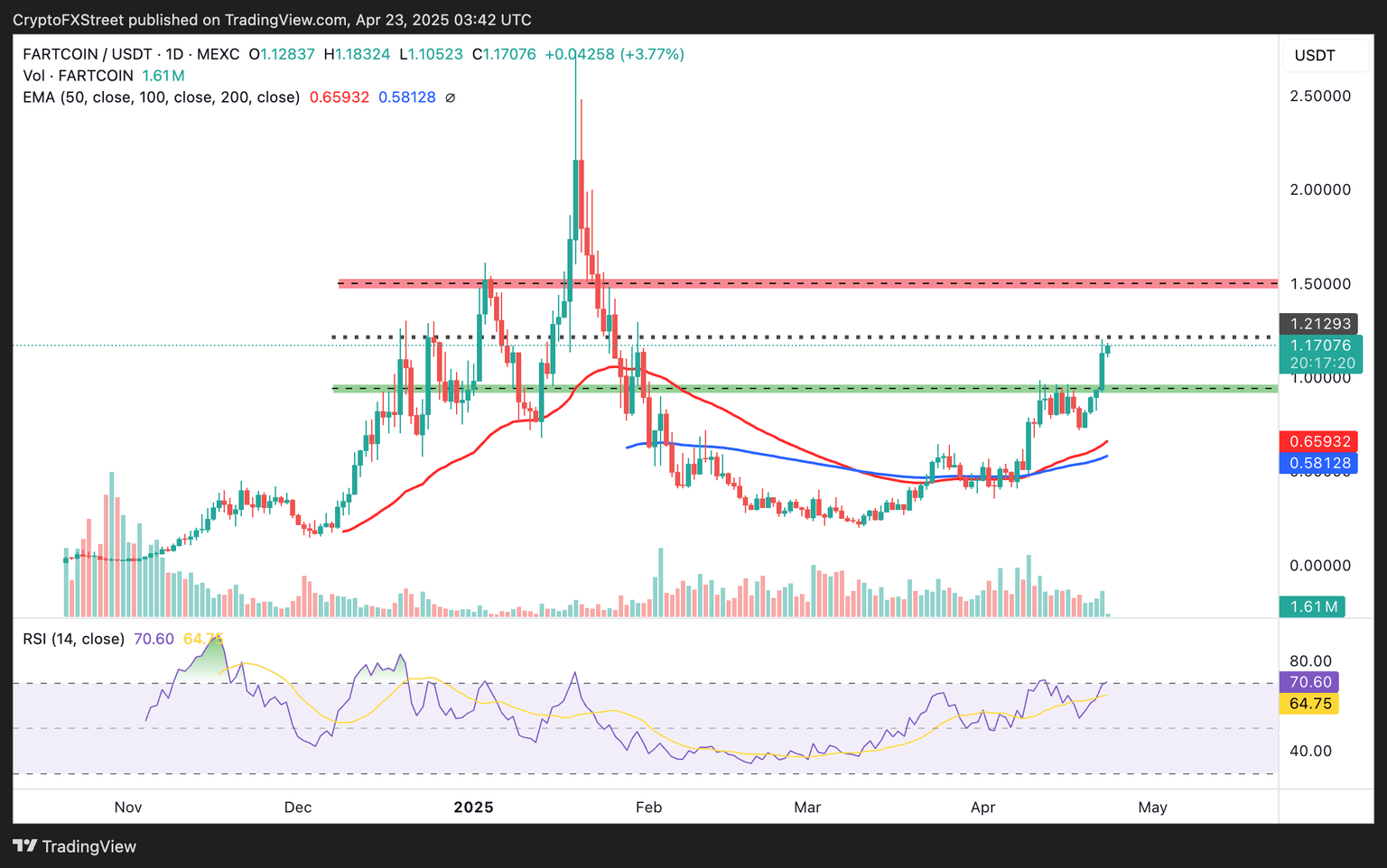 - Fartcoin extends its bullish leg above $1.00, testing short-term resistance at $1.20.