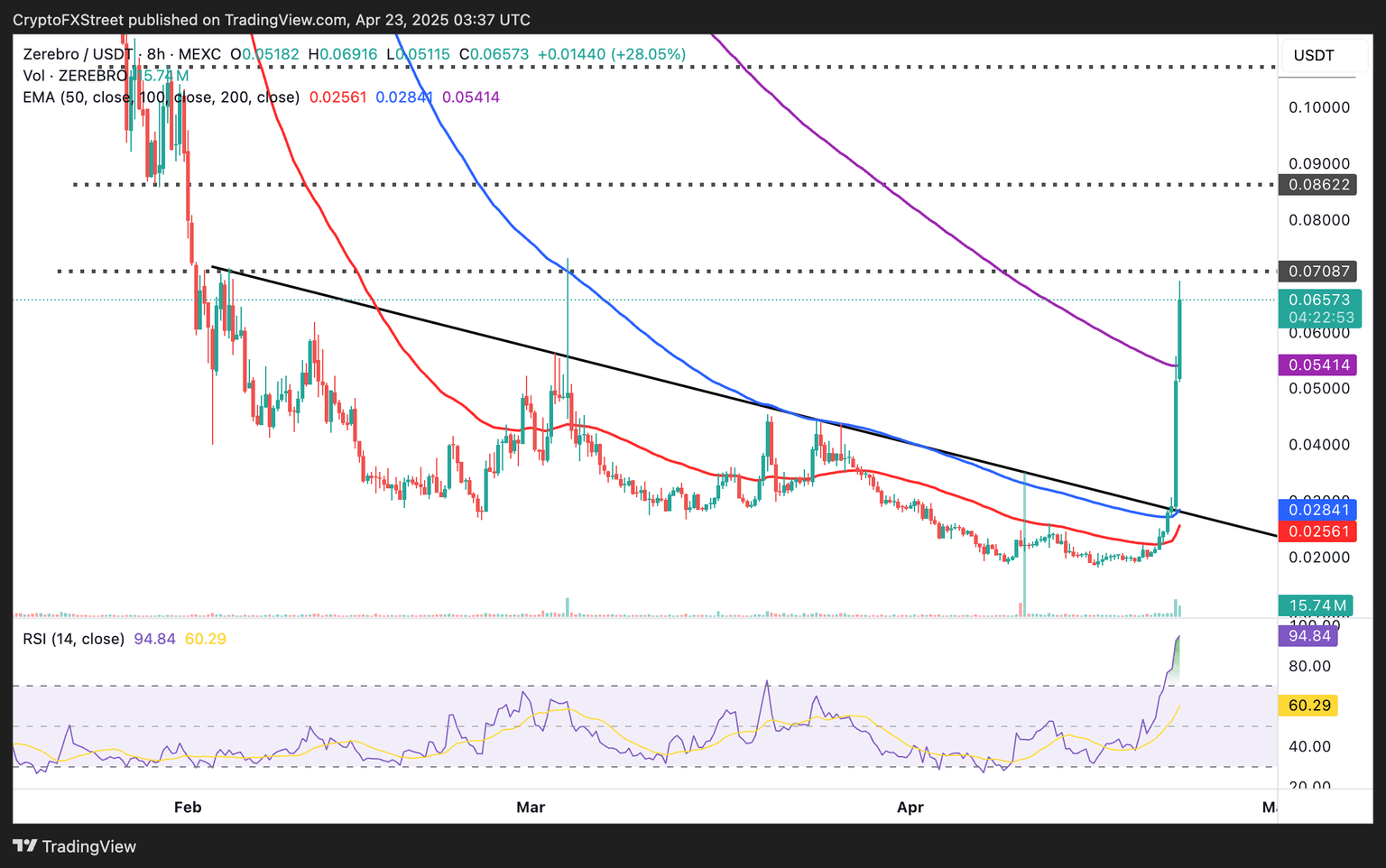 Zerebro’s price surges more than 20% on the day to trade at $0.0669 at the time of writing. The Solana-based meme coin holds above the 200 EMA on the 8-hour chart, cementing the bulls’ presence in the market.