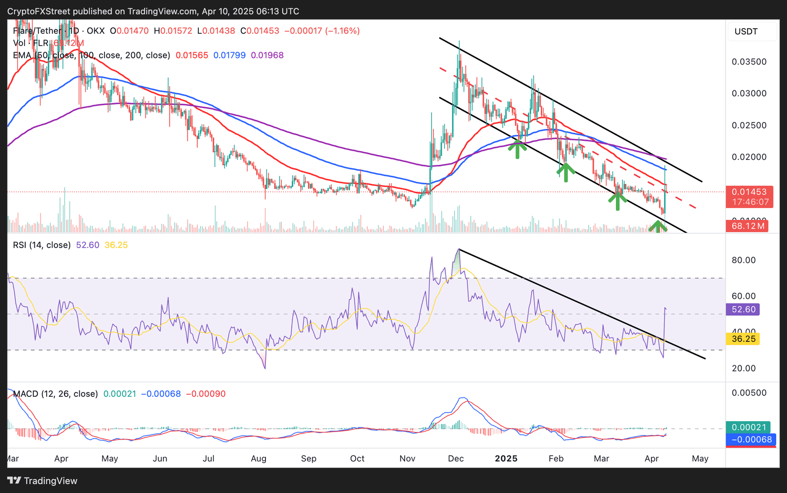 Flare leads the bullish brigade after President Trump's tariff pause on Wednesday. The token bounced from channel support at $0.0108, as observed in the daily chart below, before coming to a halt at $0.0187, slightly below the channel's upper resistance.