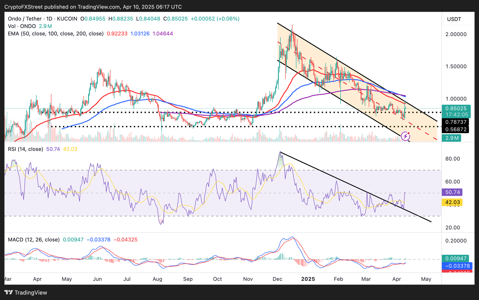 Like many cryptocurrencies, Ondo is in the green, hovering at $0.8500 at the time of writing on Thursday. The token sits above the descending channel's middle line, eyeing a breakout above the upper resistance near the 50-day EMA at $0.9223.