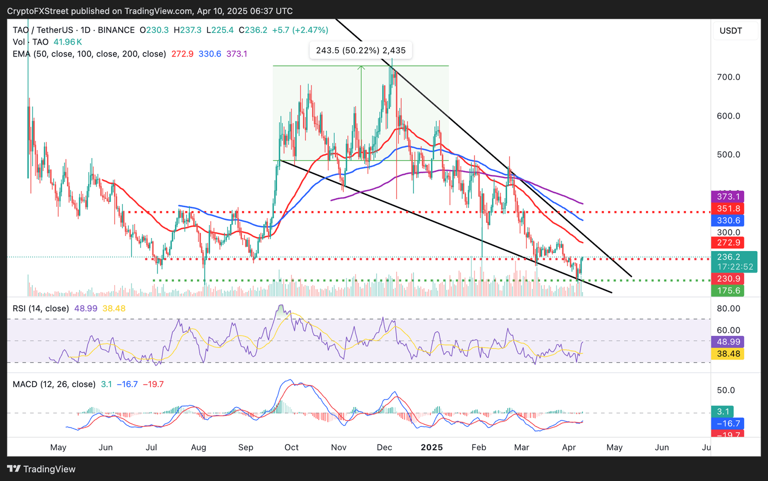 Bittensor, an Artificial Intelligence (AI) token, defended $175 support amid Monday's tariff-triggered sell-off. The pause on tariffs encouraged traders to buy the dip, creating bullish momentum behind the token. TAO surged above $200 and extended gains to trade at $236 at the time of writing on Thursday.