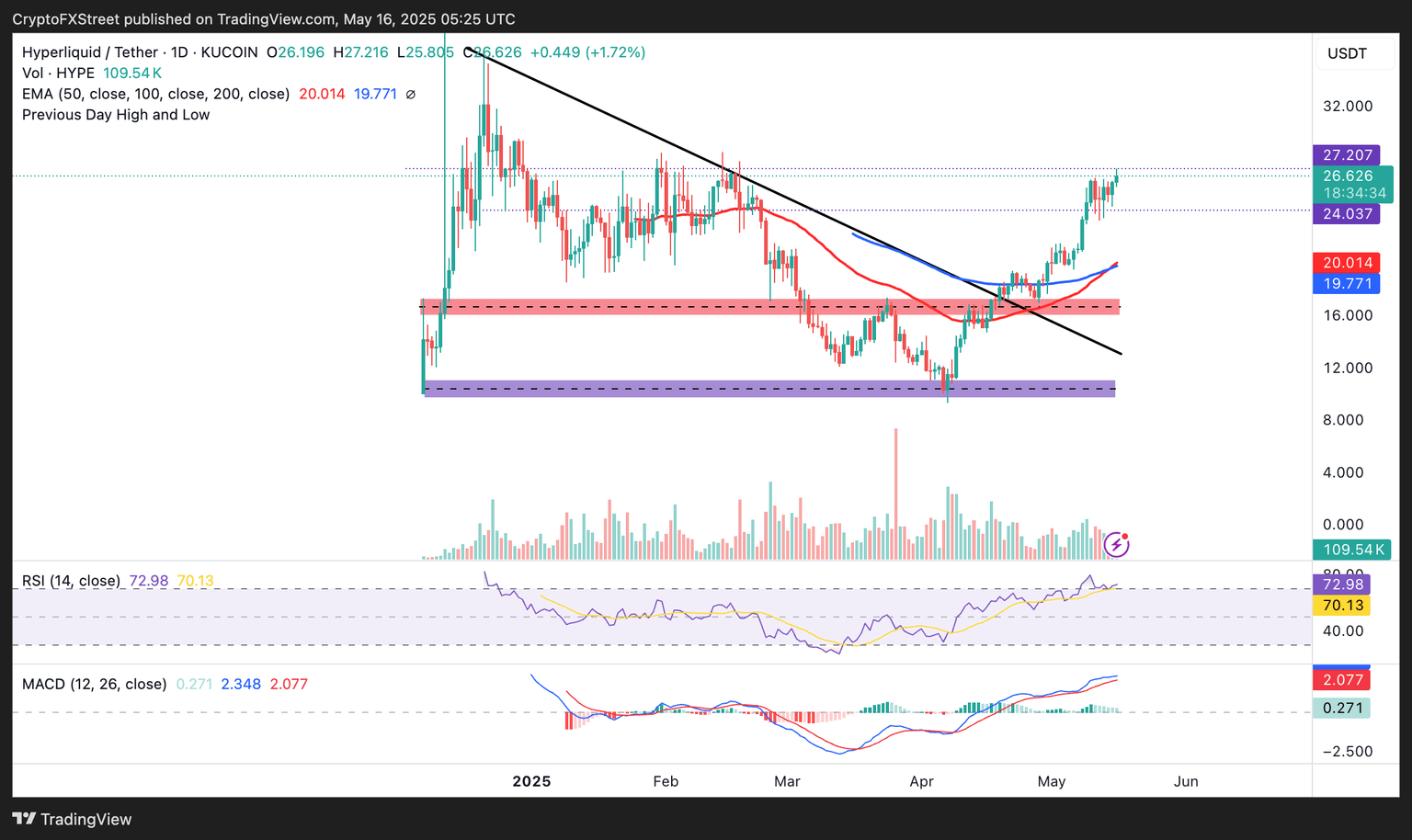 Hyperliquid's surge from the tariff-triggered crash on April 7 is still intact as it exchanges hands at $26.68 after breaching several crucial supply zones, including the five months descending trendline resistance, the former 50-day Exponential Moving Average (EMA) hurdle around $16.00 (marked red on the chart) and the seller congestion at $20.00.