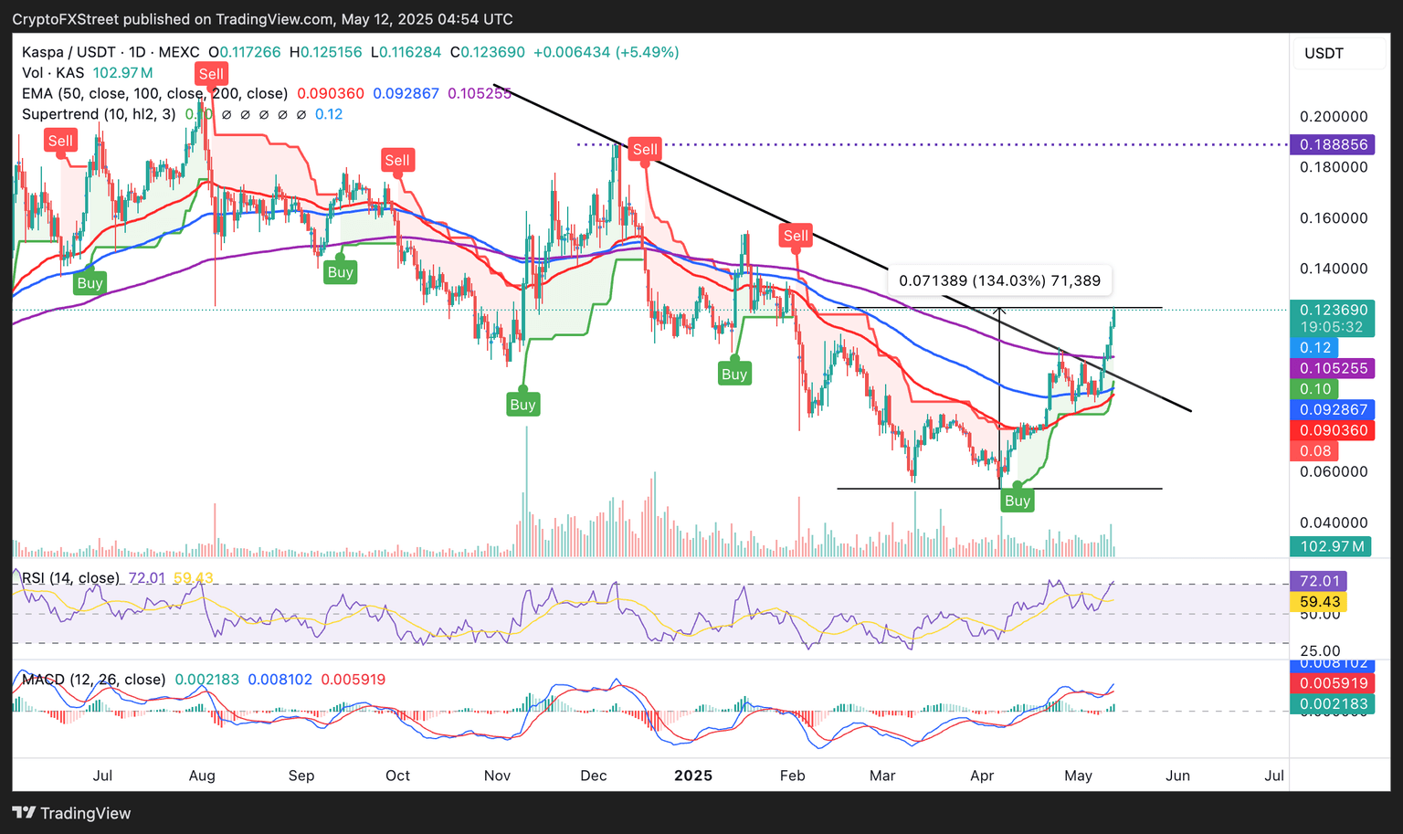 Kaspa’s price sits on top of a crucial five-month trendline resistance, accentuating the growing bullish influence in the wider crypto market. After an impressive 134% increase from the tariff-triggered crash to $0.053 on April 7, KAS currently hovers at $0.12, up more than 6% on the day.