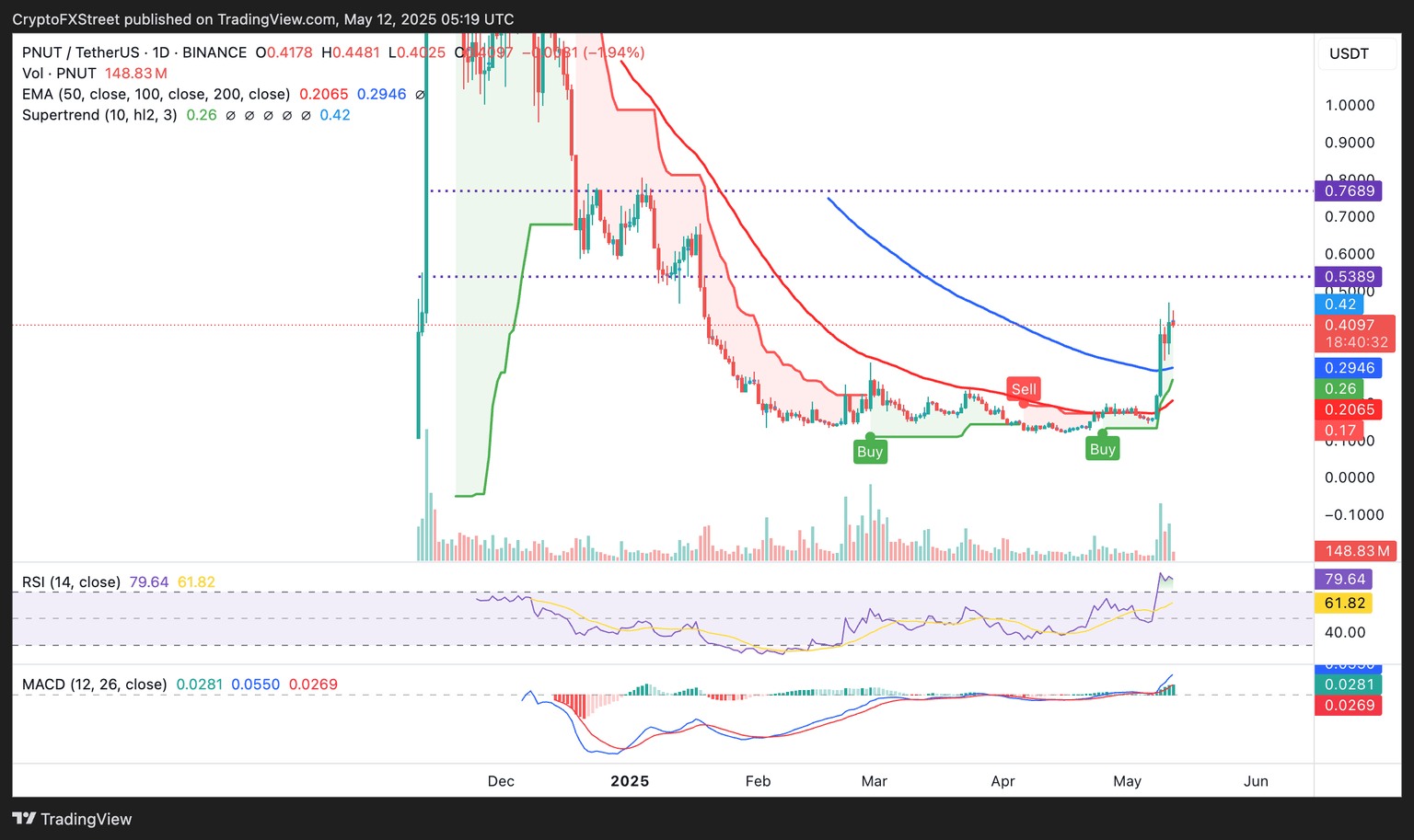 - PNUT’s upward trend holds steady above $0.40 despite extremely overbought conditions.
