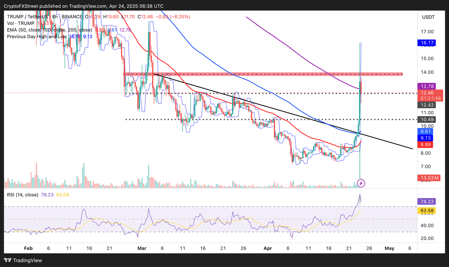 TRUMP exploded in double-digit gains following the announcement, reaching a daily high of $16.17. However, the meme coin has since clawed back some of the gains, possibly due to profit-taking.
