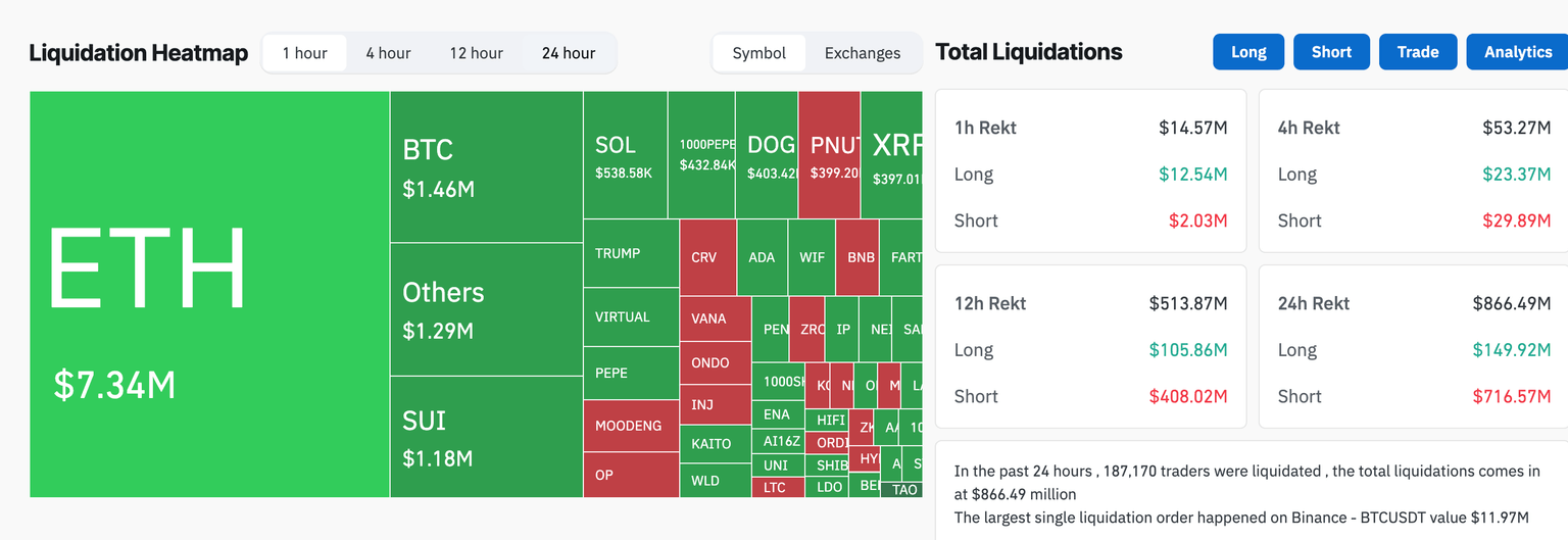 - Liquidations surge in a bullish crypto market, reaching $866 million in 24 hours.