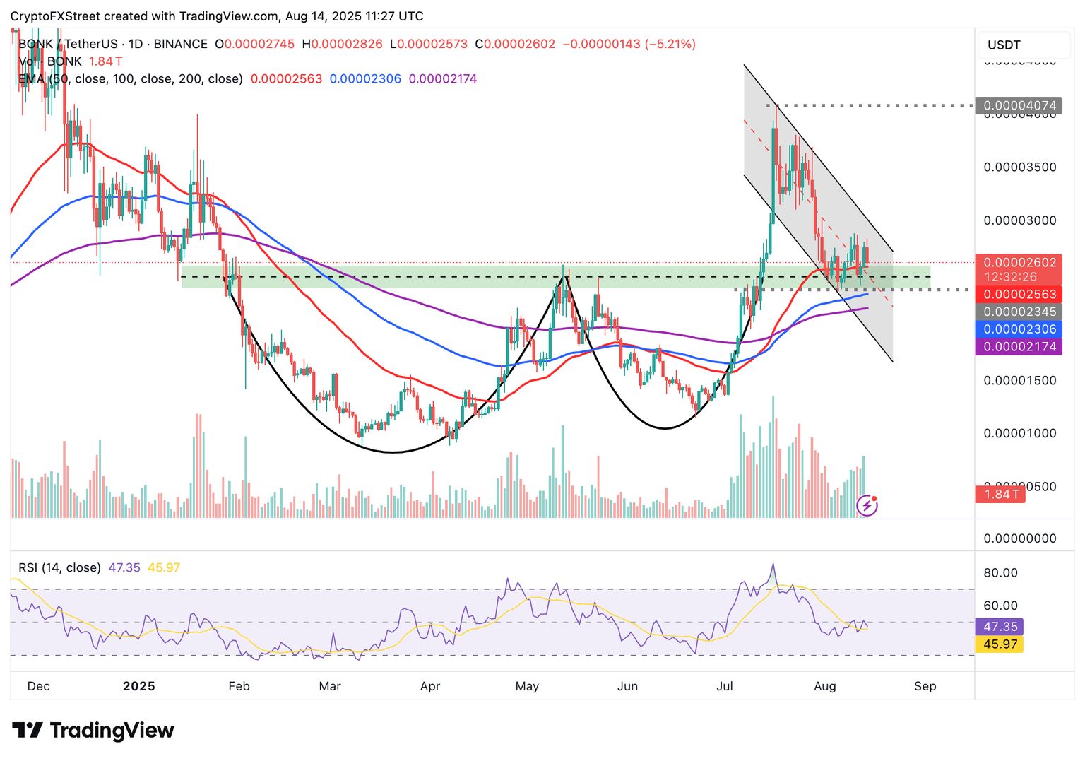 Bonk price is down over 12% on the day, trading at around $0.000026 at the time of writing. The meme coin also holds above a Cup-and-Handle pattern’s neckline resistance-turned-support around $0.000025.