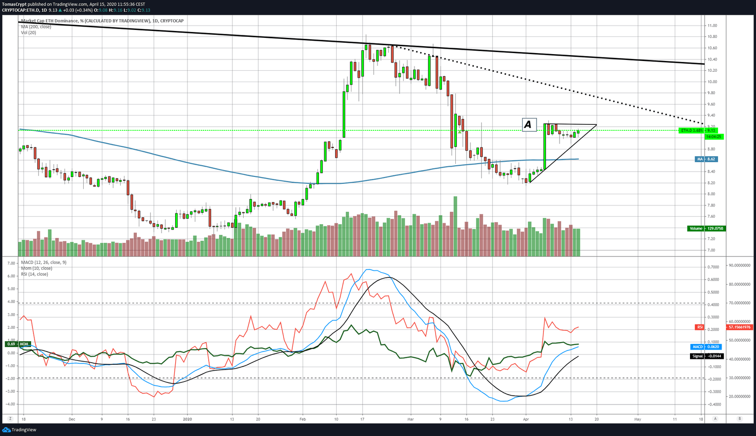 The resistance level to beat (A) is 9.13 of dominance for the Ether, then the next at 9.75 and the third one at 10.40