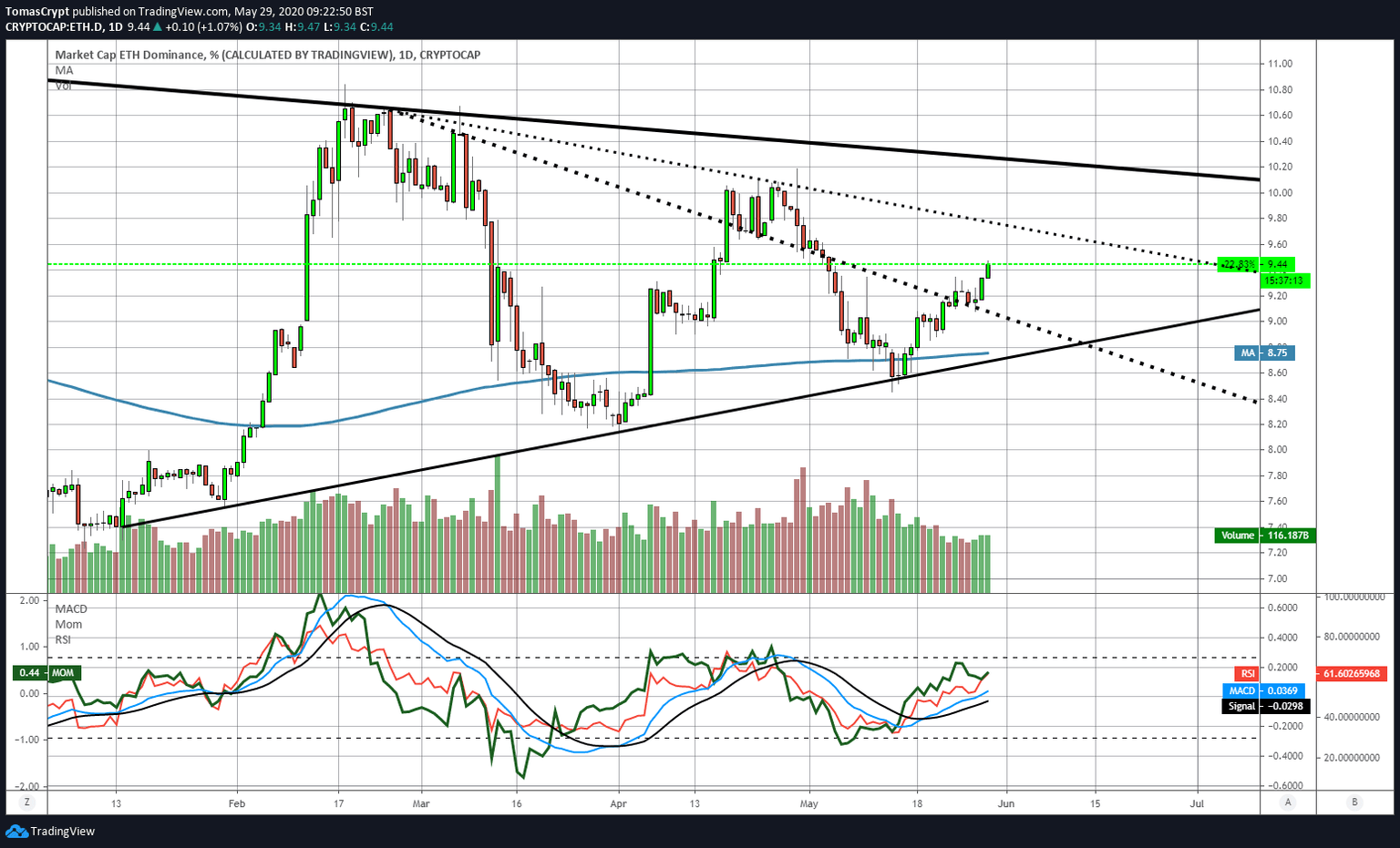 Ethereum shows potential to continue to rise against Bitcoin and has room to move from the current dominance level of 9.41% to the resistances of 9.75% first and 10.25% later.