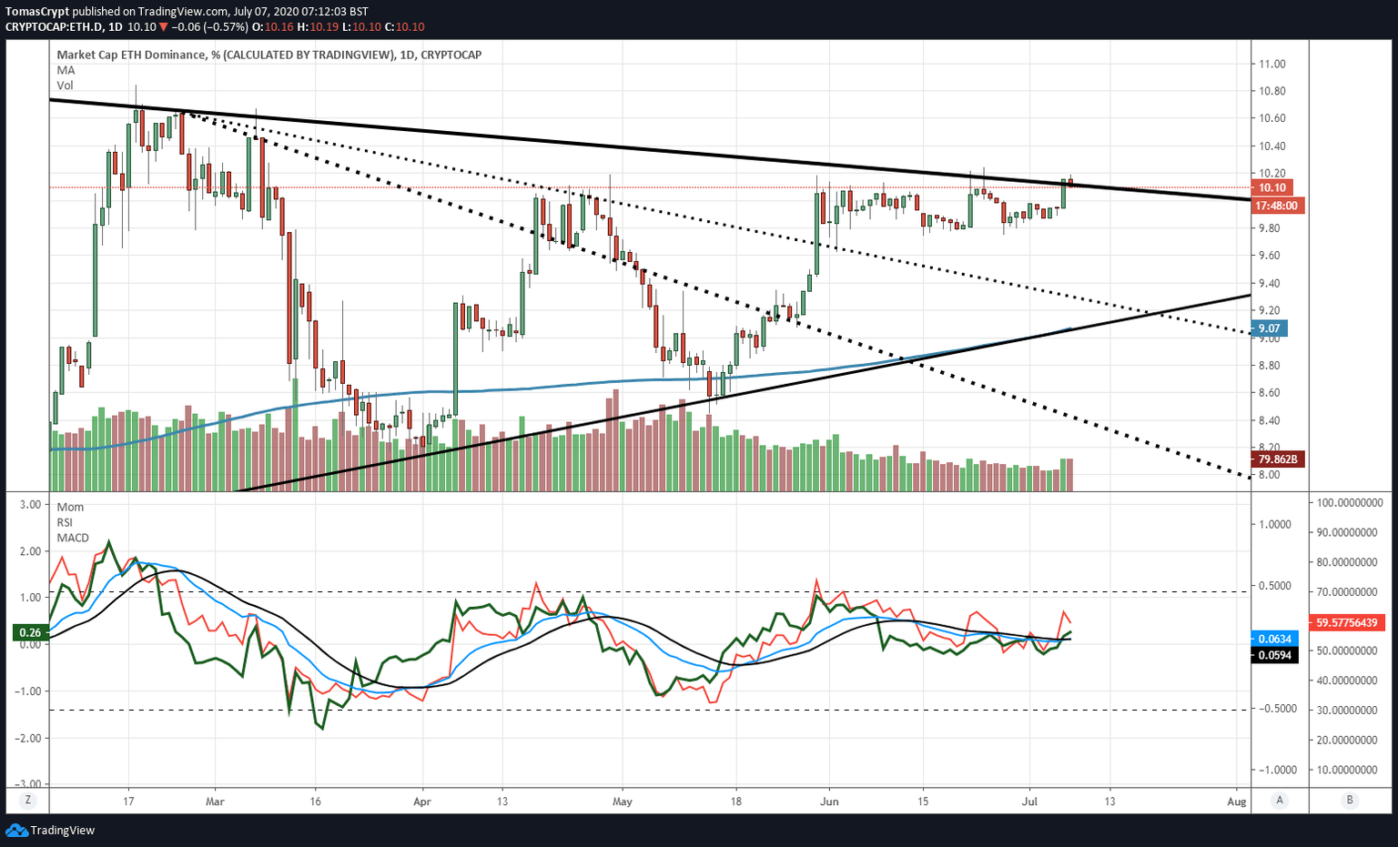 The Ethereum's dominance chart shows weakness in the opening of the European market, and it moves threateningly below the resistance level conquered yesterday. A daily close below the 10.12% dominance level would be very dangerous for the short term.