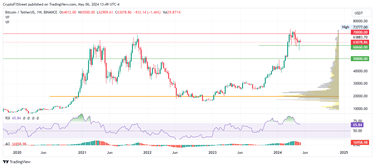 - Bitcoin price must break through either $70,000 or $50,000 to decide next stable directional bias on weekly time frame.