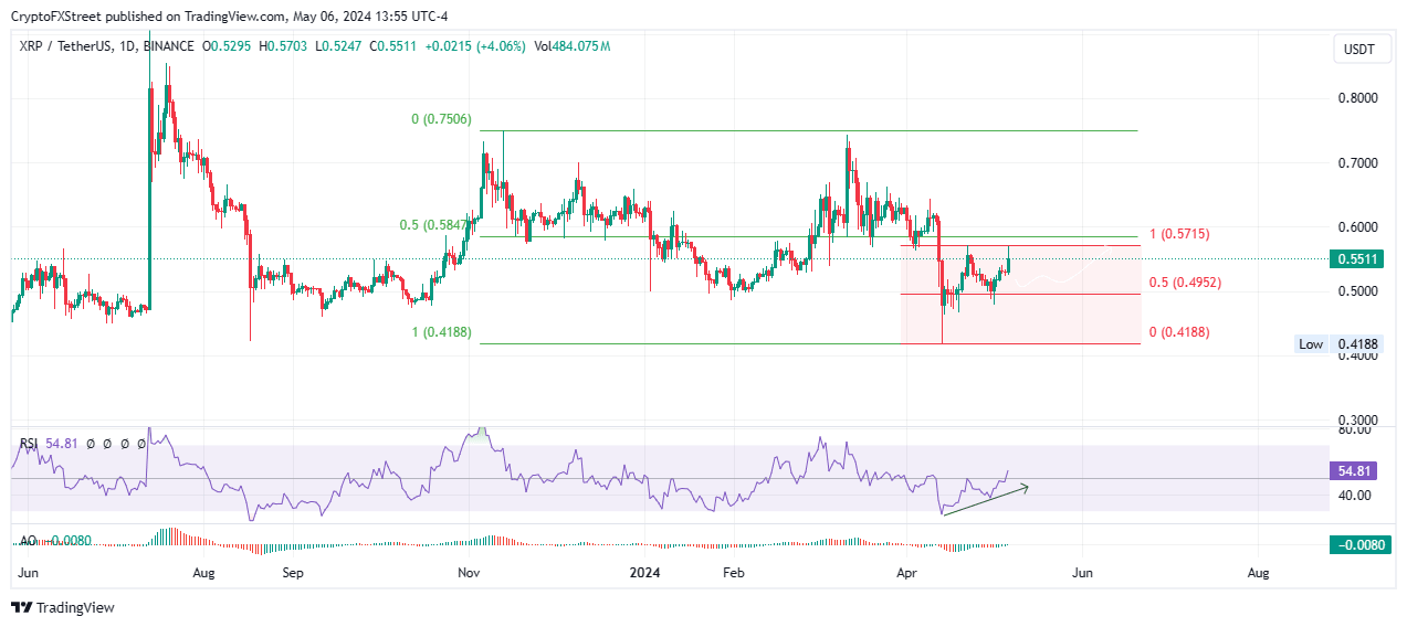 Ripple price recorded an intraday high of $0.5703 on Monday with the potential for more gains as XRP bulls continue to show strength. If bulls manage a stable move above the peak of the market range at $0.5715, it would clear the path for a continuation of the uptrend above the 50% Fibonacci placeholder of the larger market range at $0.5847. This could set the tone for Ripple price to test the $0.6000 psychological level, nearly 10% above current levels.