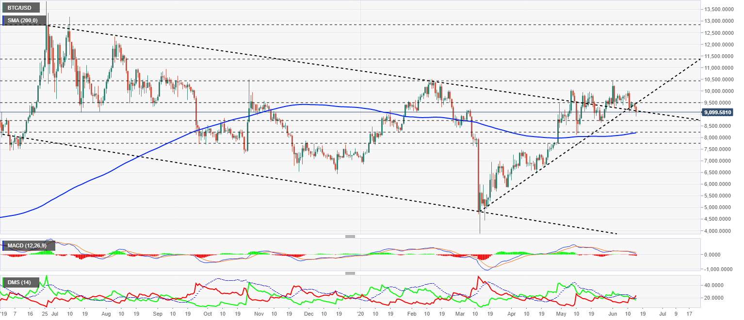 The BTC/USD pair is currently trading at the price level of $9099 and is exiting the bullish quadrant of the chart to move directly into the bearish scenario within the long-term downward channel. Only a close above the $9150 level would avoid the danger and leave the BTC/USD price in the middle quadrant.
