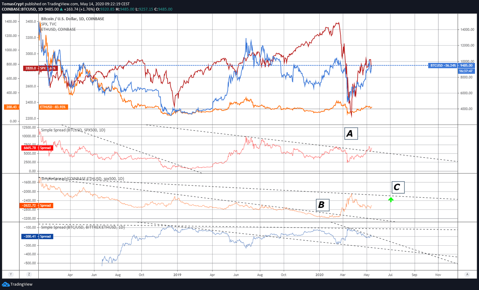 Ethereum also plays this game, and for the time being, is the lagging member of the journey. Ethereum kept the negative relationship against the S&P500 until last February 23rd when it broke the upward trend that the spread indicator (B) had been showing. The next clear target for Ether is in the bearish trend line (C).